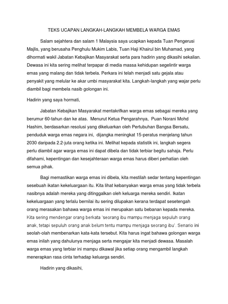 100 2 100 menganggap dokumen ini bermanfaat 2 suara 861 tayangan 3 halaman. Microsoft Word - UCAPAN YBM HARI WARGA EMAS NEGERI SEMBILANdocx Created Date. Di Malaysian takrifan orang tua atau warga emas yang digunakan ialah mereka yang berumur 60 tahun yang dibuat di World Assembly On Ageing 1982 di Vienna.